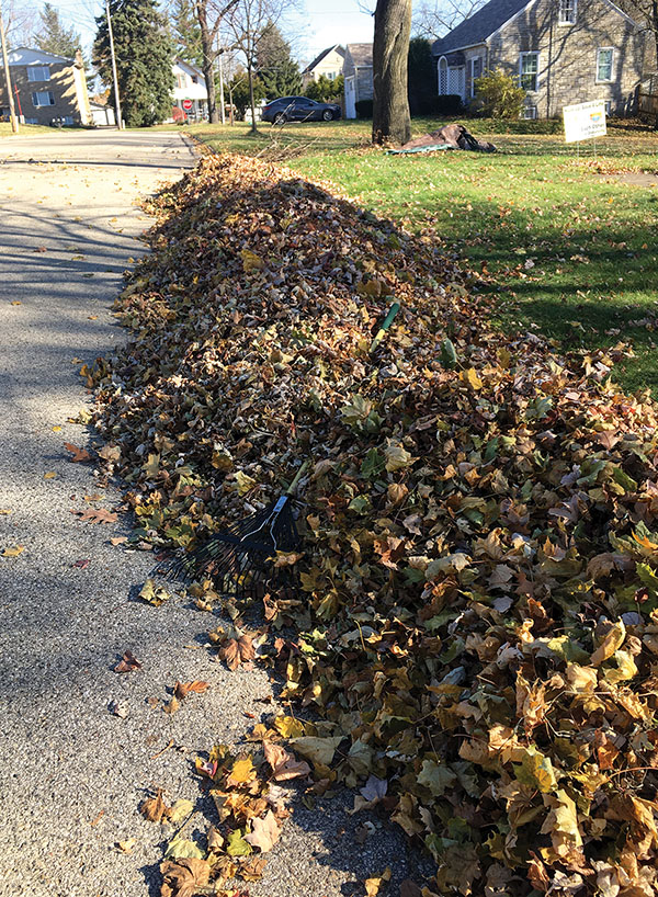 Leaves raked to the street in anticipation of city collection.